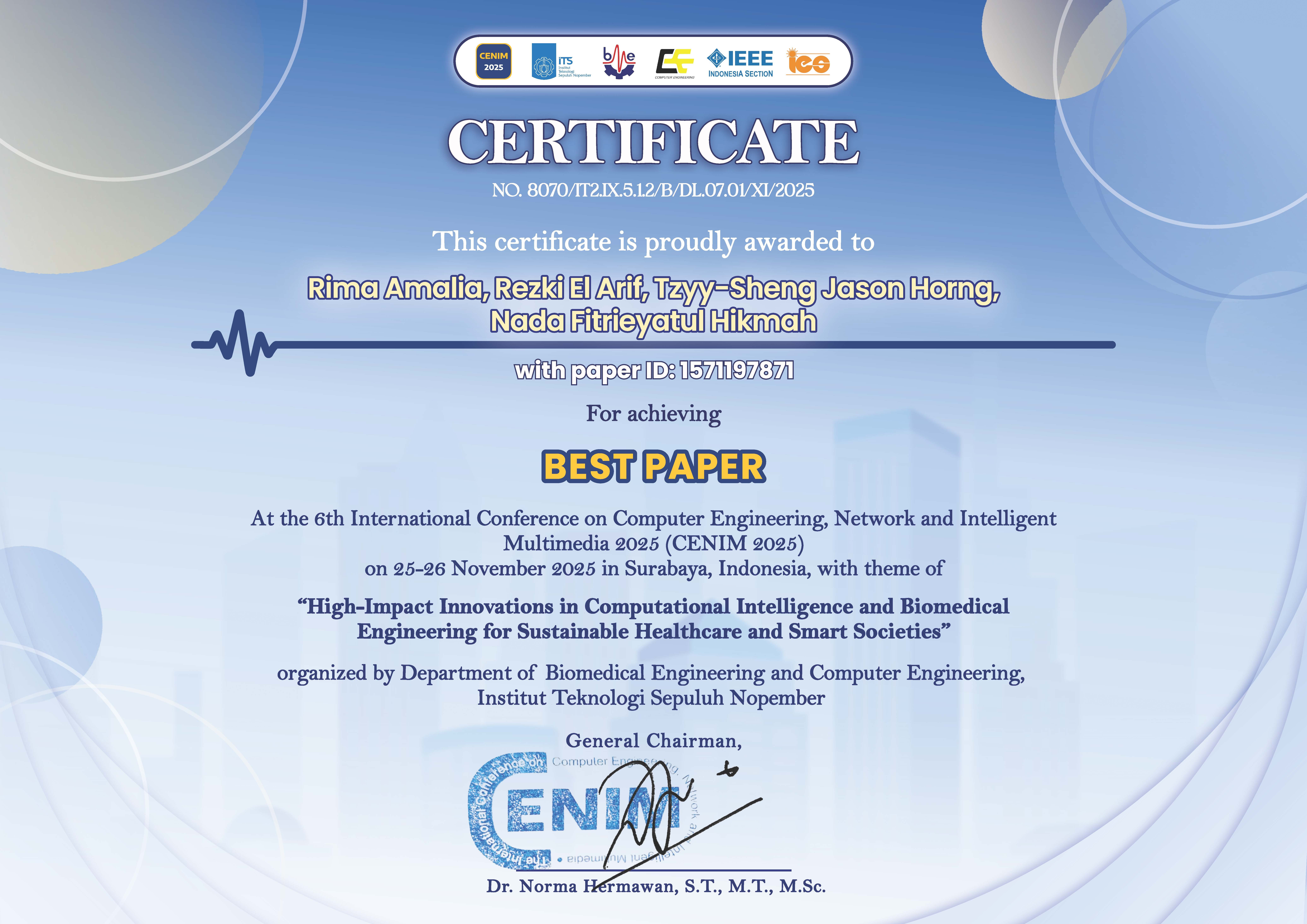<Honor> Congratulations to our program student 瑞伊瑪(Rima Amalia) upon earning the Best Paper Award at the 6th International Conference on Computer Engineering, Network and Intelligent Multimedia 2025 (CENIM 2025)